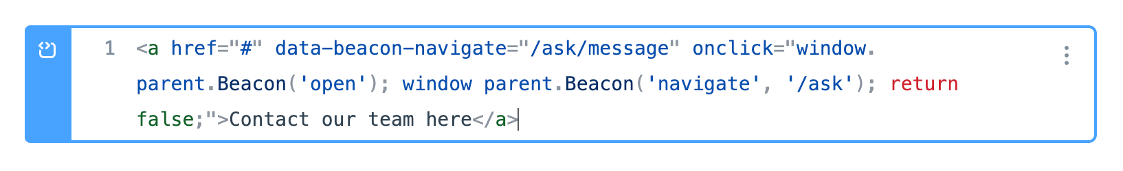 <a href="#" data-beacon-navigate="/ask/message" onclick="window. parent.Beacon('open'); window parent.Beacon('navigate', '/ask'); return false;">Contact our team here</a>
