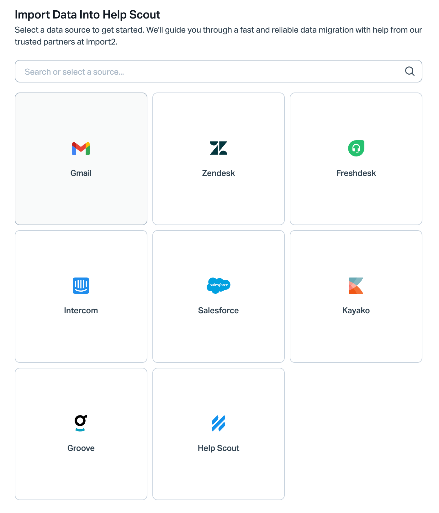 Moving to Help Scout is easier than ever — we've partnered with Import2 to offer an easy way to import emails or tickets from a number of providers, allowing you to have quick and easy access to your customer history after you've made the move.