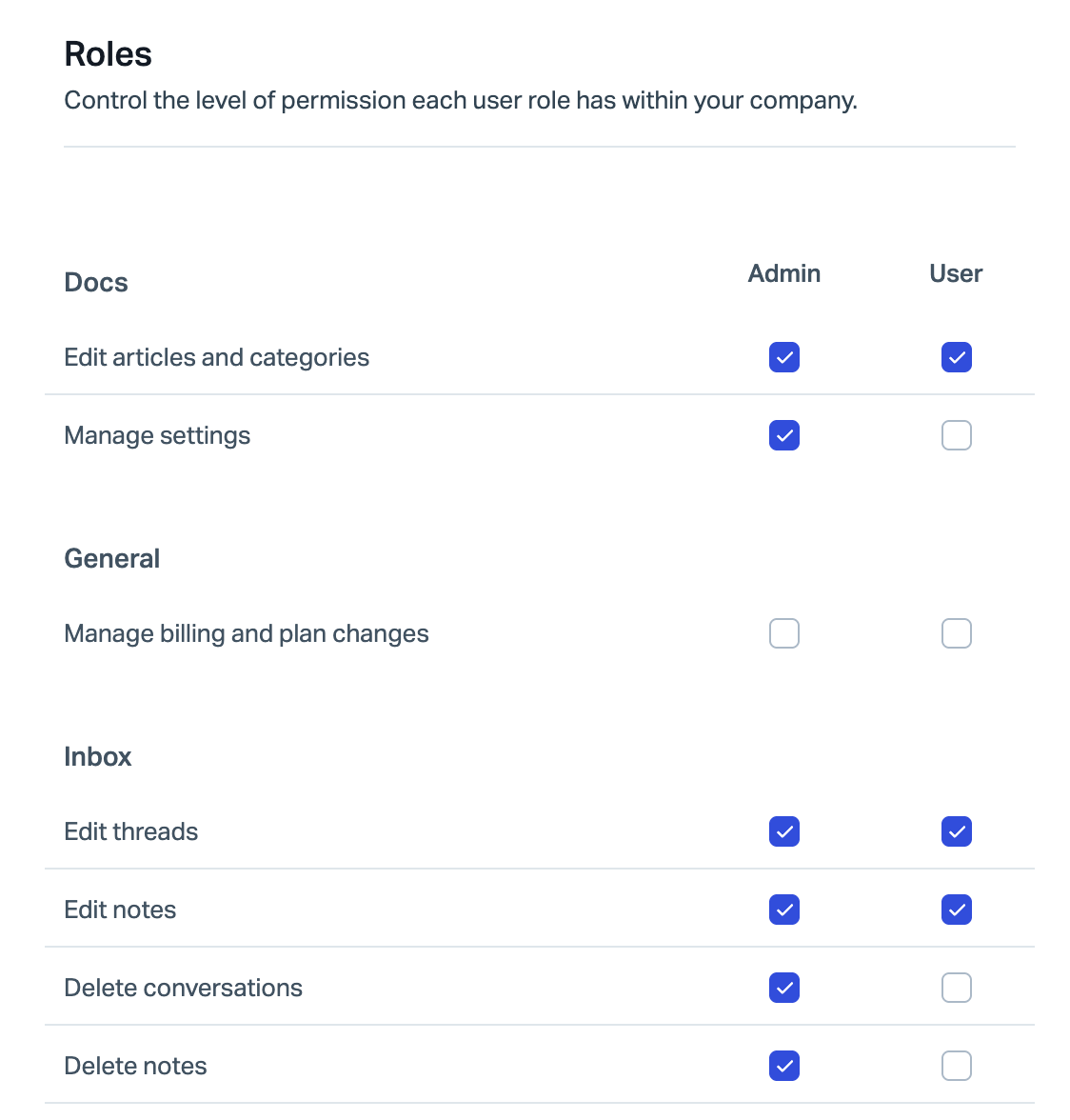 A User only has access to Inboxes as specified. All conversations in an Inbox that a User has access to are visible to that User but a User is not able to change Inbox settings. They have access to create and edit articles on every Docs site, but cannot change the Docs site settings. In addition, Users are not able to create other Users or access User profiles. Users can view available third party integrations on the Apps pages but cannot install them. Users cannot delete conversations, notes, customers, or Teams. Users cannot manage workflows, custom fields, or saved replies.