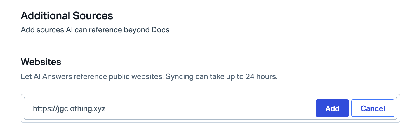 AI Answers will crawl the pages from your additional sources and will use any text it finds there to answer questions, along with your Docs knowledge base.
