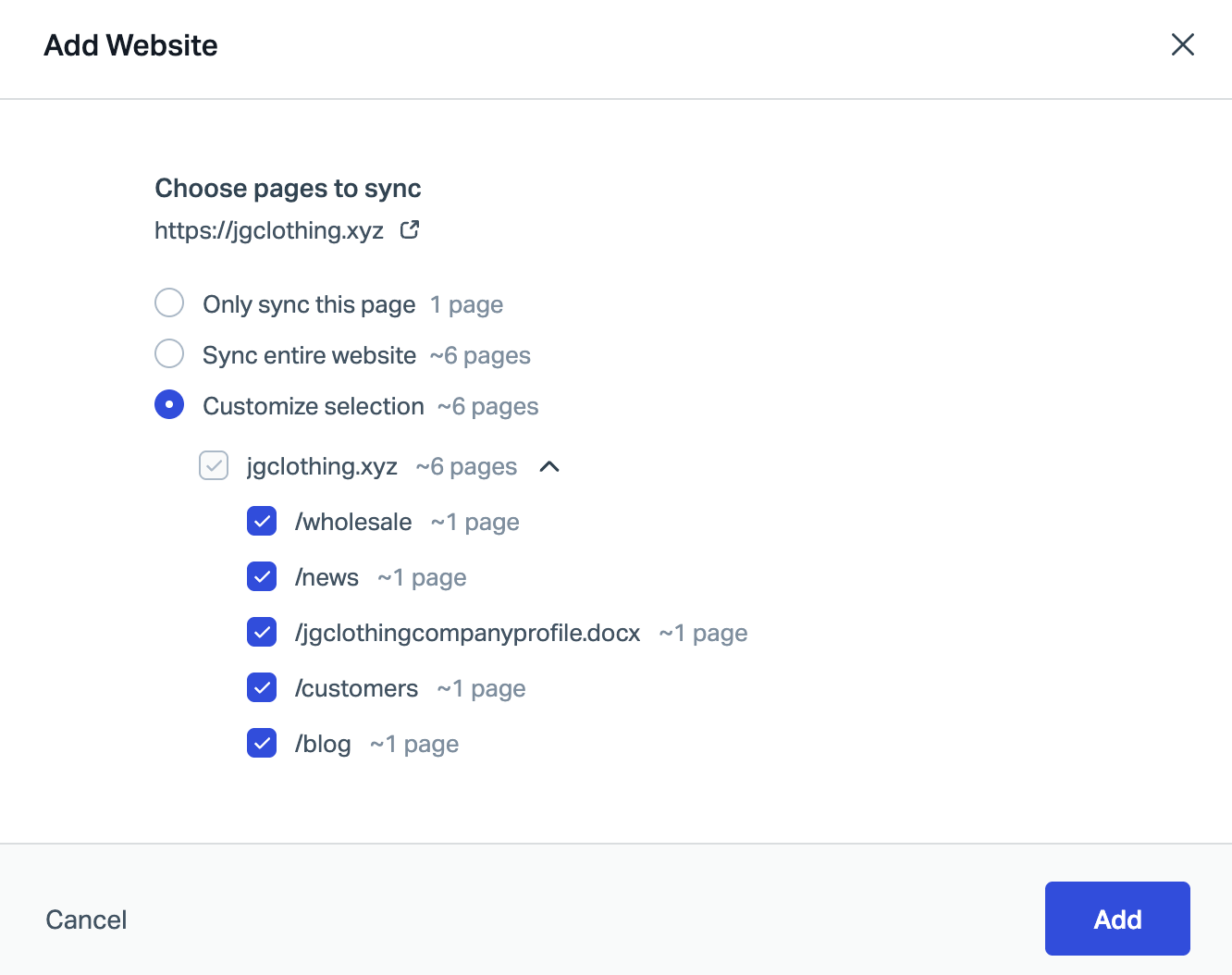You'll be given the option to sync the just the page you enter, the entire site, or customize your selection. Content of any PDFs, Word, or Excel documents in the space you add can also be synced, or link to those directly.