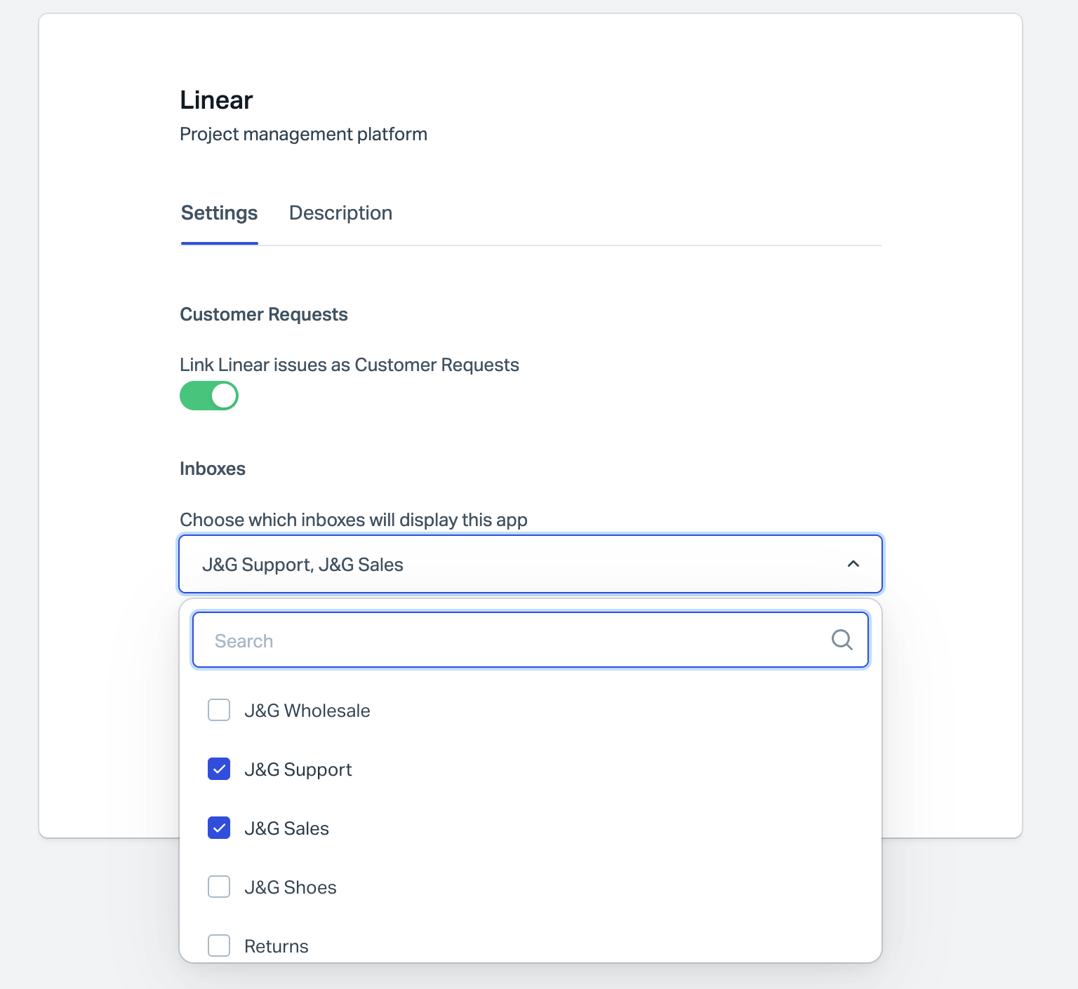 Choose the Help Scout Inbox(es) where you want Linear to be available in the sidebar of conversations. Click Save to finish the installation.