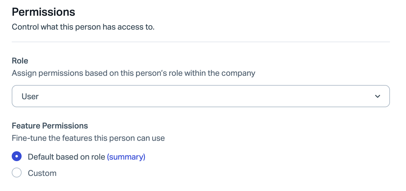 Default will set the permissions based on the user's role. Choose Custom to select permissions for only this user.