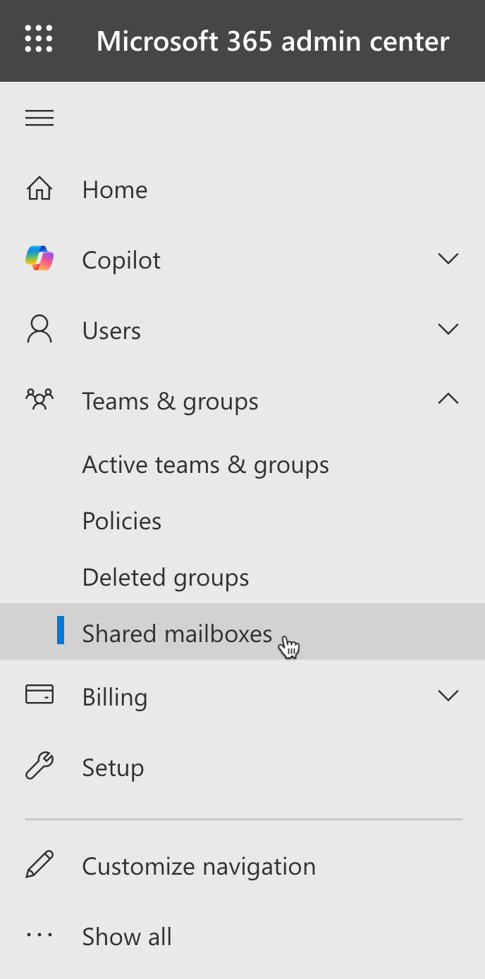 Log in as the Microsoft 365 administrator at the Microsoft 365 admin center and navigate to Teams & groups > Shared mailboxes. This direct link may work if you are already logged in: https://admin.microsoft.com/Adminportal/Home#/SharedMailbox