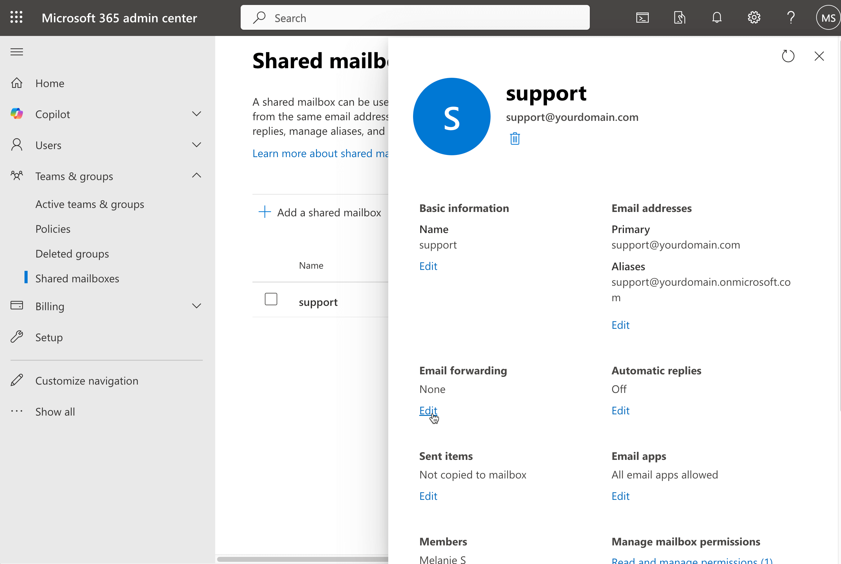 Find your shared mailbox in the list and click on it. In the side modal that opens, find the section titled Email forwarding and click Edit in that section.