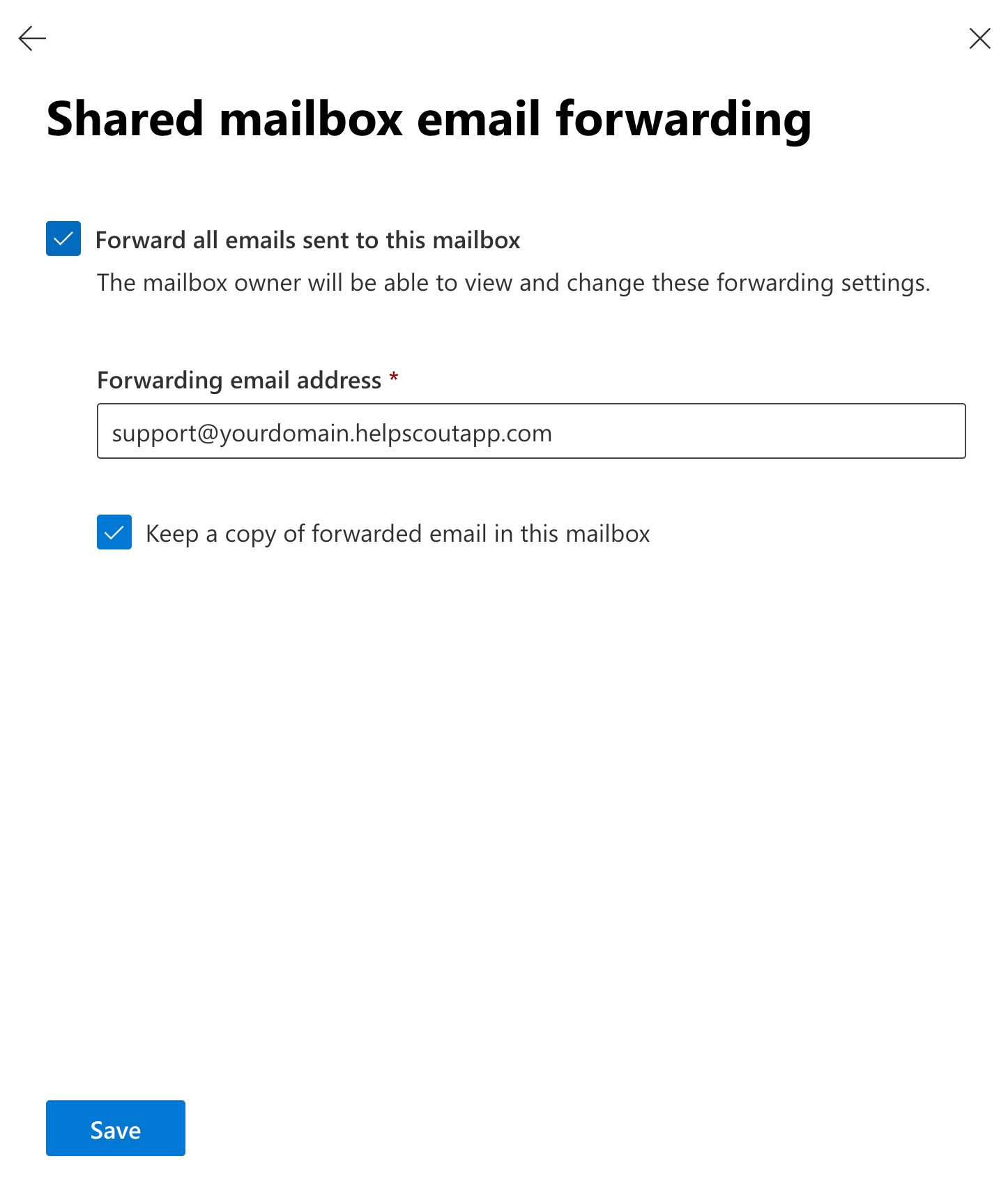 Check the box next to Forward all emails sent to this mailbox. Paste in your Help Scout Inbox address. Choose Keep a copy of forwarded email in this mailbox if you want to store a backup at 365 as well. Click Save at the bottom to save the changes.