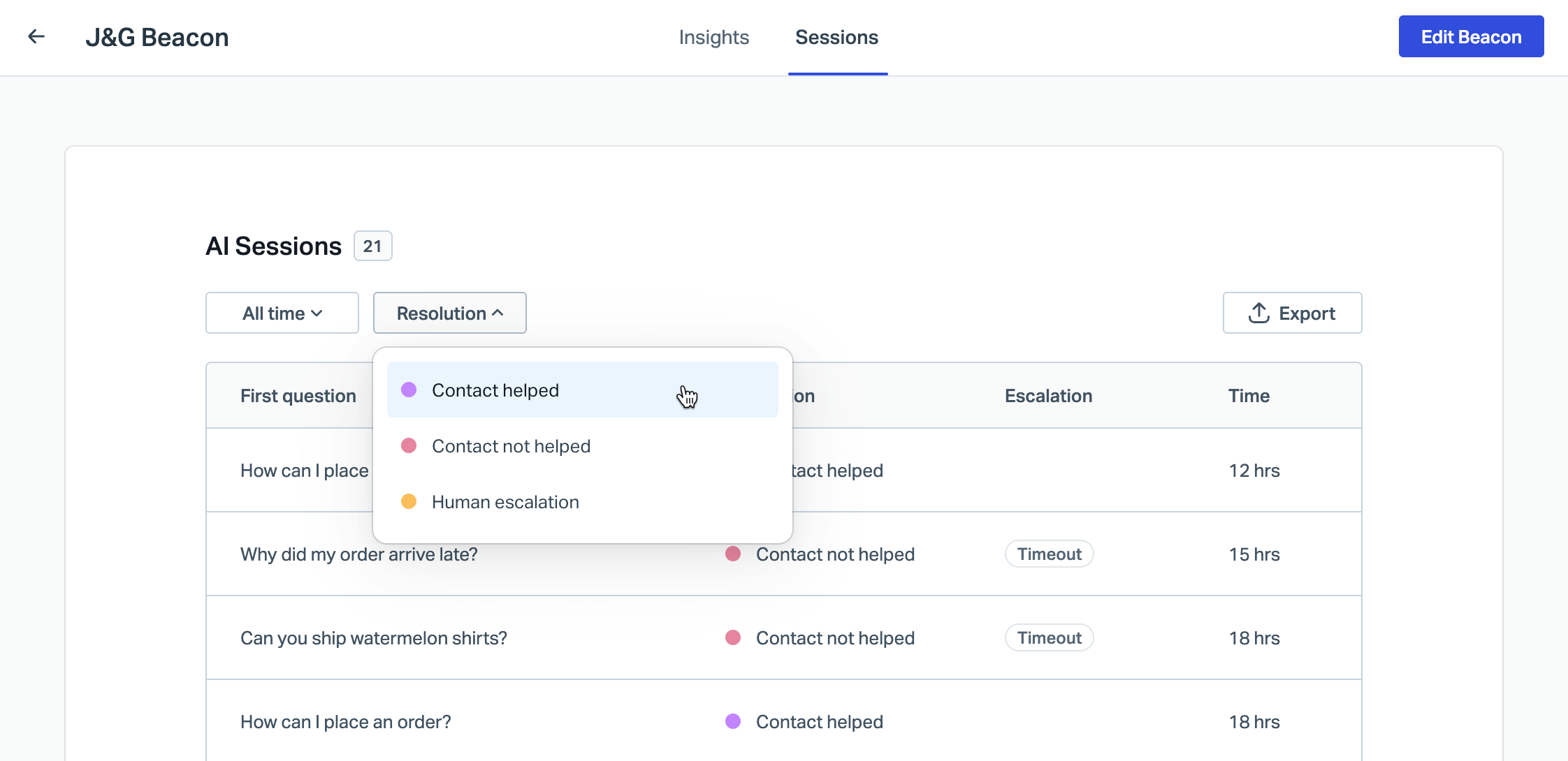 You can review the AI conversations that are billable in the AI Answers reports. Head to Manage > Beacons > [Choose your Beacon with AI Answers] then choose the Sessions tab. Click the Resolutions drop down and choose Contact helped to view all of the sessions that were resolved by AI Answers.
