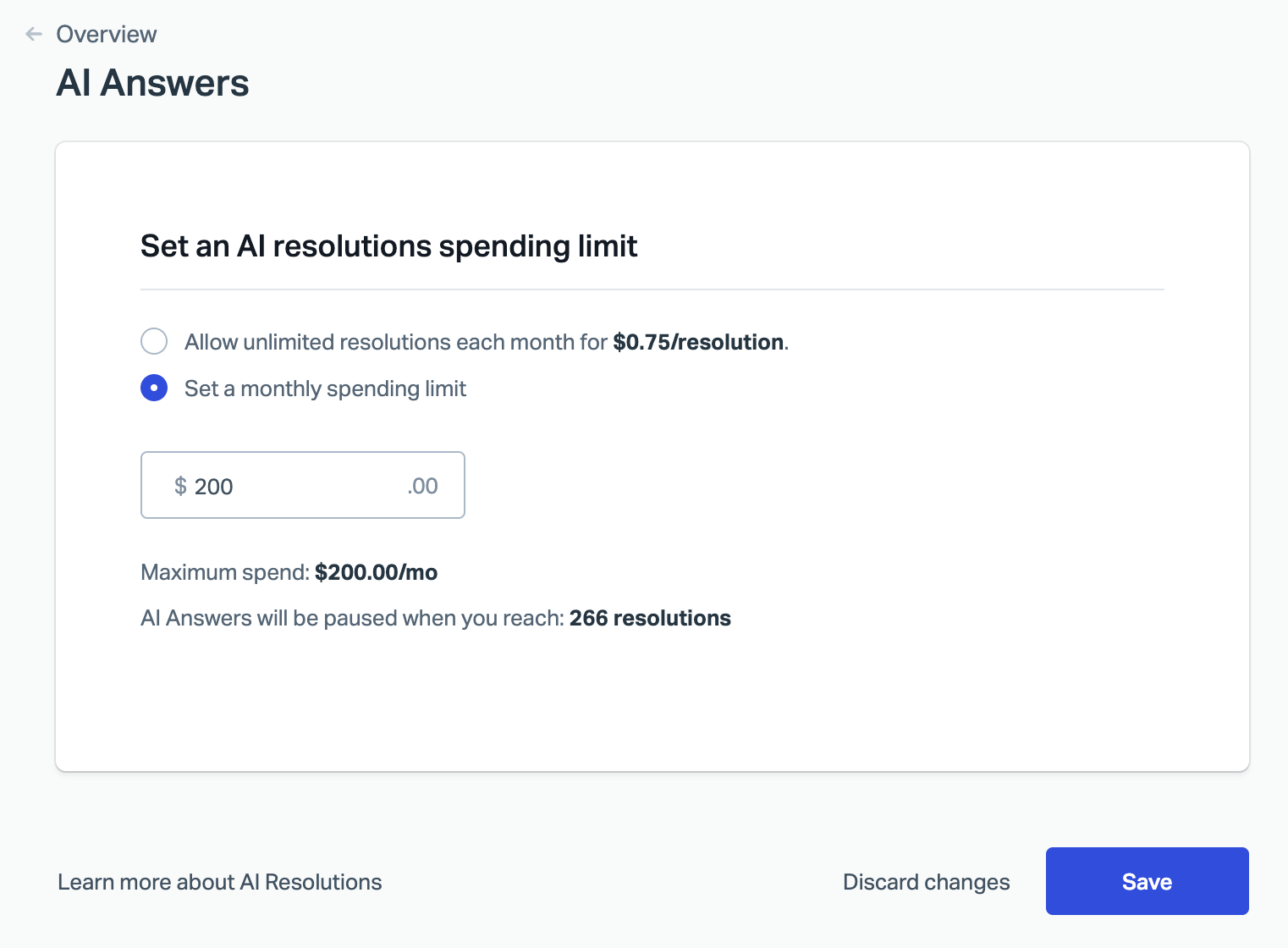 You control your AI Answers usage by setting a monthly spending limit. Choose to base the limit on either a dollar amount or the number of AI resolutions. Both options are available in the AI Answers management dashboard, and your usage is tracked in real time.