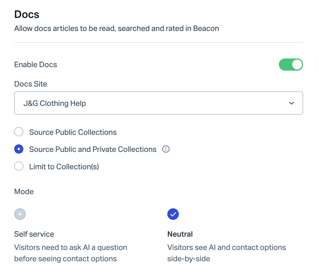Beacon will switch to the mode you've set at Manage > Beacons > [Choose your Beacon] > Edit Beacon > Docs.