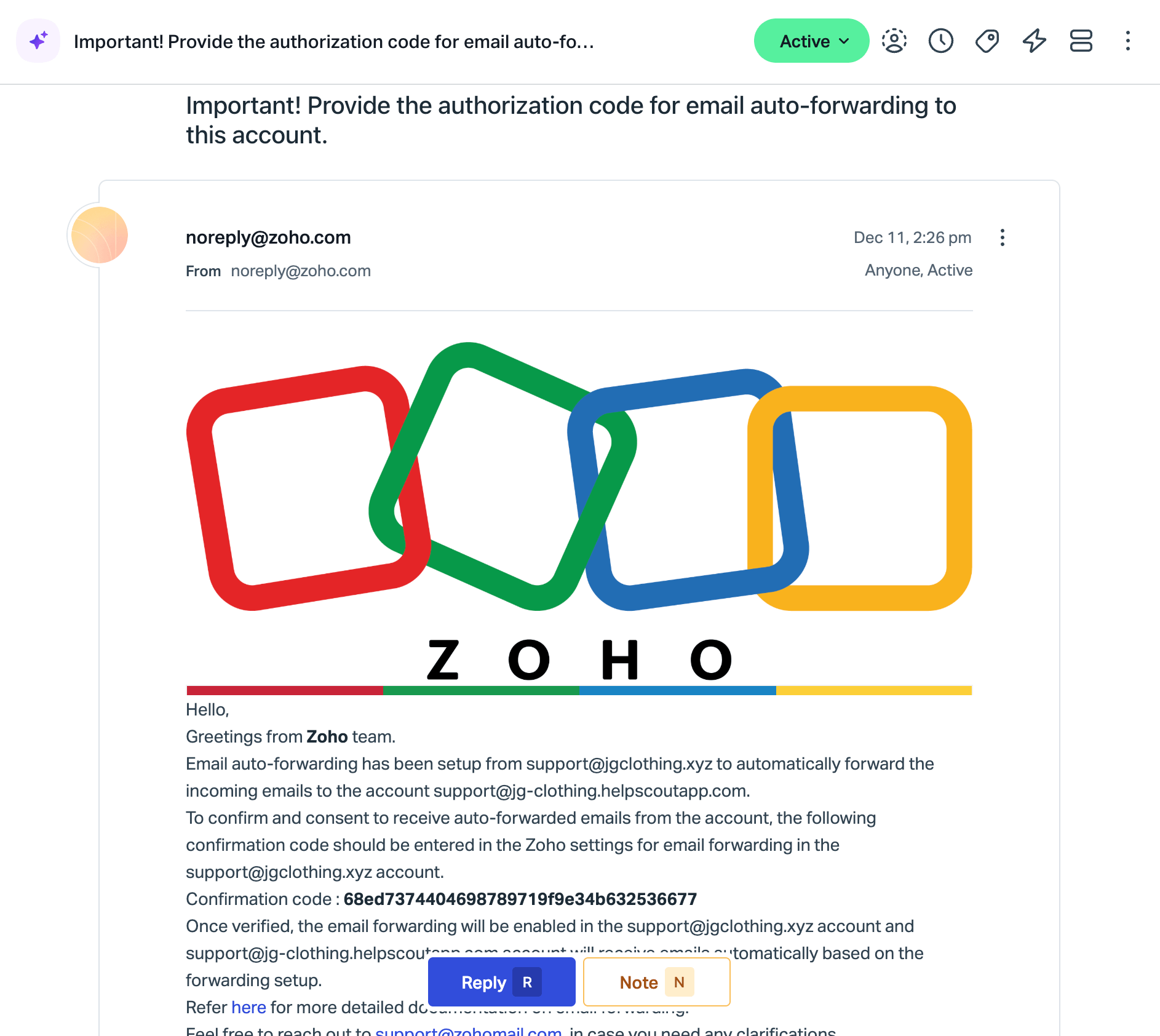 Head back to your Help Scout Inbox, where you'll find an email from Zoho with a verification code. Copy that code from the email.