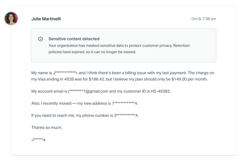 Advanced Privacy Controls give you more control over how sensitive customer data is handled in Help Scout. The feature automatically masks personally identifiable information (PII) in conversations and allows you to control who can reveal it. Admins can also define how long sensitive data and attachments are retained before being permanently removed.