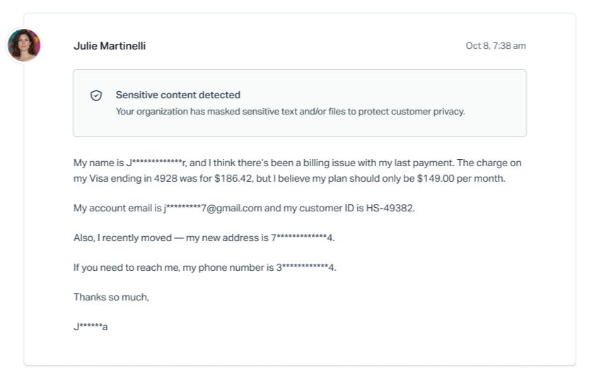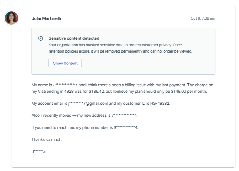 If sensitive data is detected, it is immediately masked. A secure copy of the original information is retained temporarily. Once your configured retention period expires, the original data is permanently deleted, leaving only the masked version in the conversation.