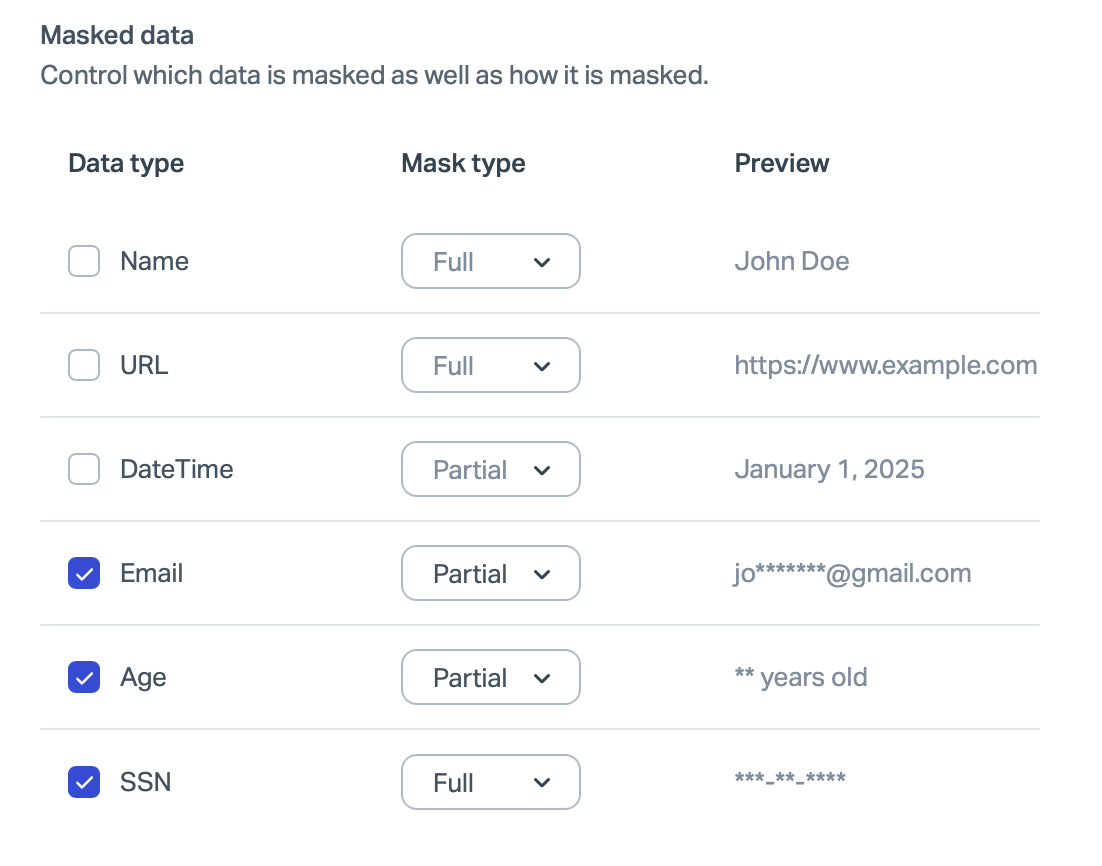 Under Masked Data, customize how common data types should be masked. You can find the full list of data types that are supported here.