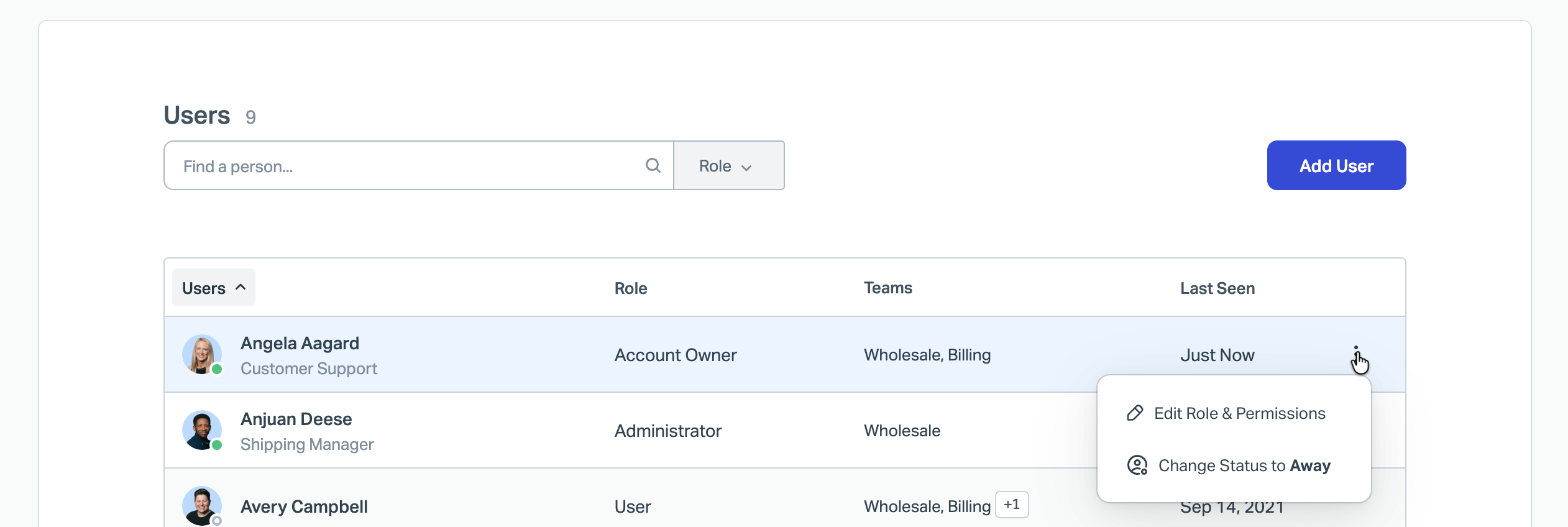 Account Owners and Admins can manage another user’s status from Manage > Users. Click into a user’s row or open the three-dot menu to change their status to Active or Away.