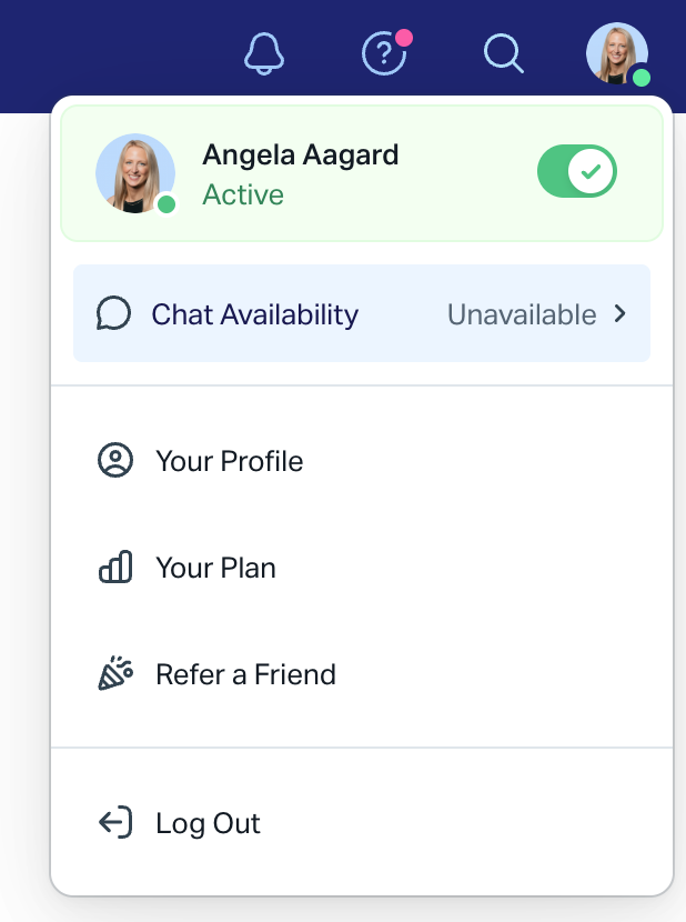If chat is enabled in a Beacon, to control your chat availability, your status must be set to Active. If your status is Away, the Chat Availability option won’t appear in the account dropdown menu.