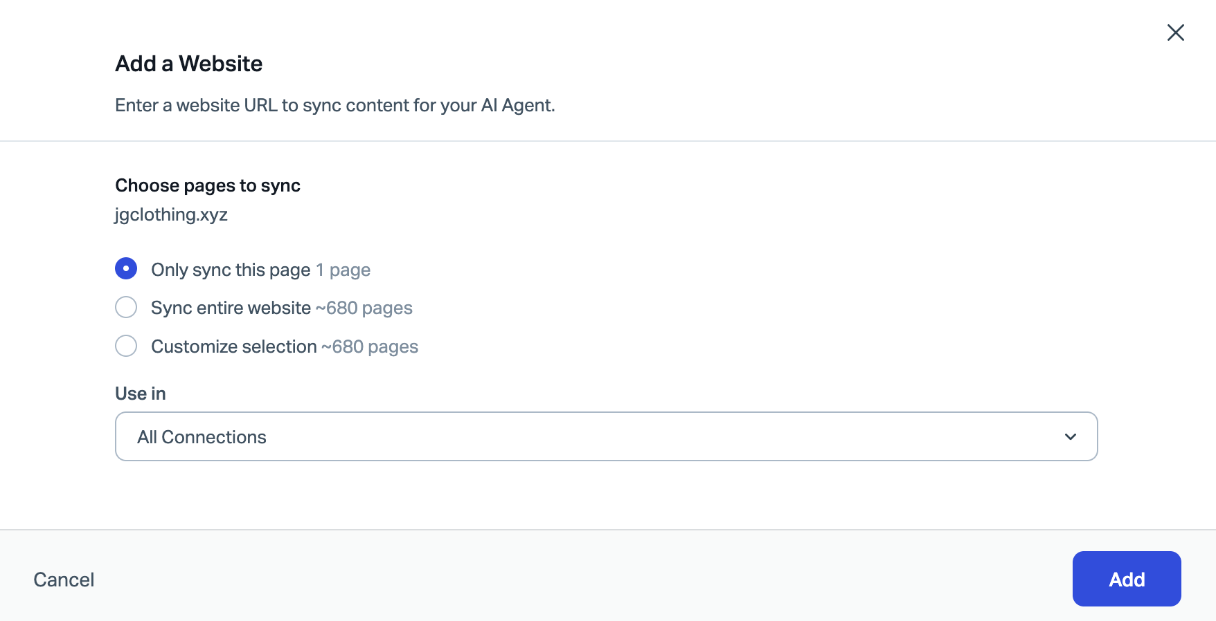 - Add a website. Knowledge bases, marketing websites, FAQ pages, PDFs, Word and Excel documents — just about any publicly available URL with information that you want your AI Agent to pull from can be added here. The initial sync of a site can take some time, depending on the size of the site. You can manually resync the sources later if there are changes made.