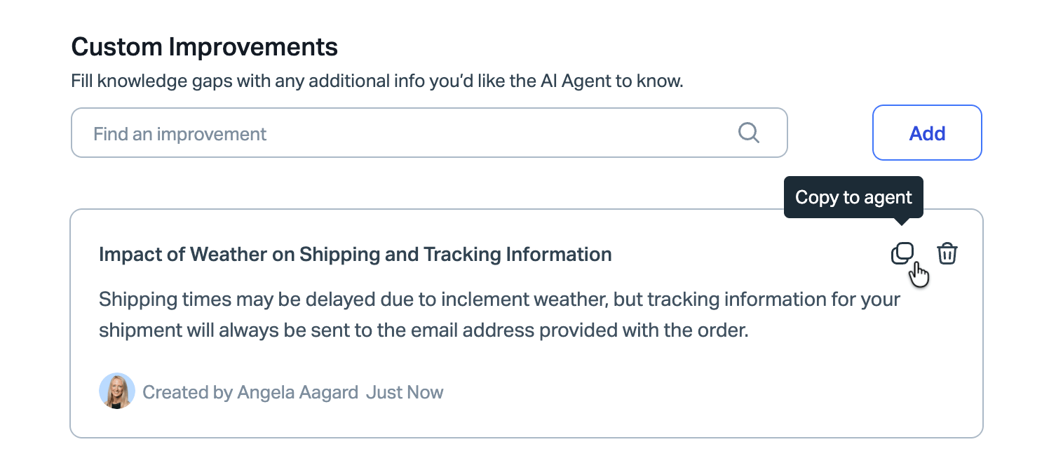 Improvements allow you to add smaller bits of knowledge or nuance to your published Docs and sources. Use them to introduce new information or clarifications to your AI Agent.