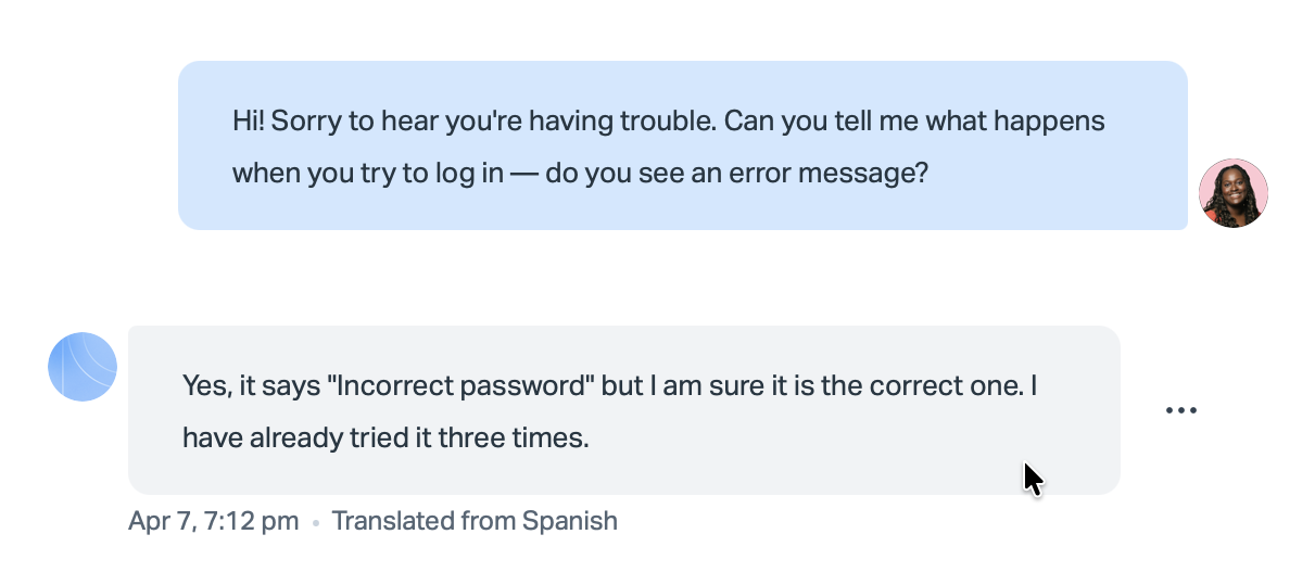 When you reply, your message is automatically translated into the customer's language before it's delivered. You write in your language; they receive it in theirs.