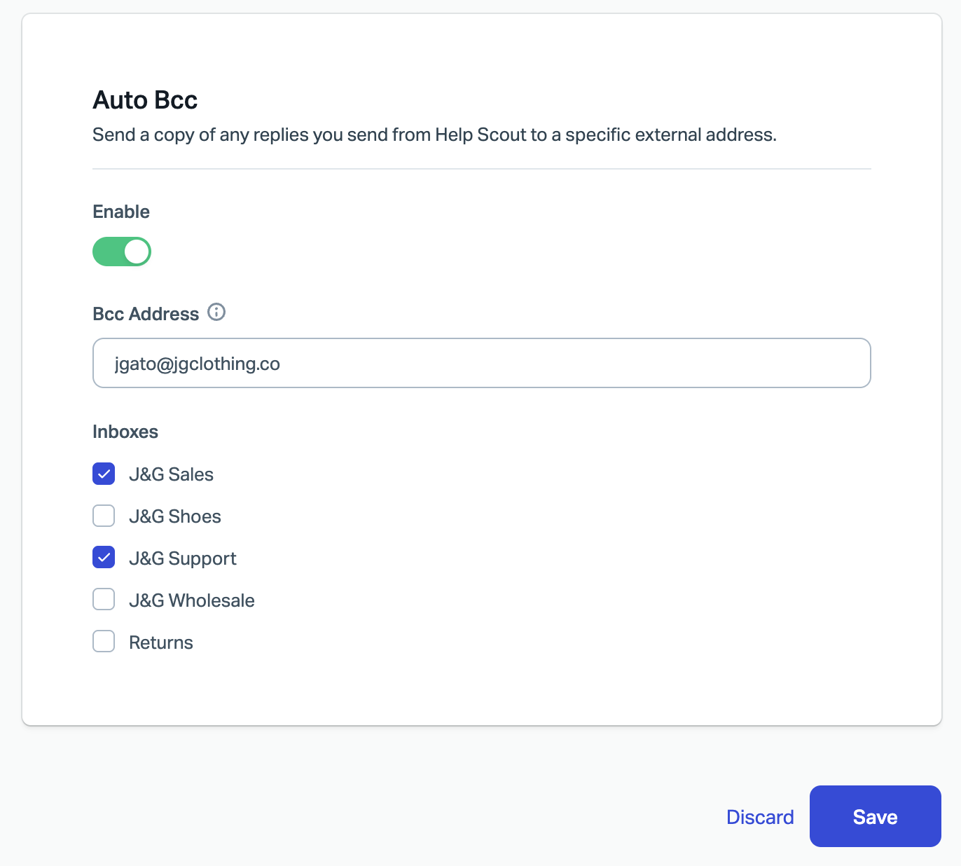 If you'd like to add an Auto Bcc address for your Inbox for all senders, any Admin can do so from your Inbox's settings page. Read more about Inbox settings in Customize Your Inbox Settings.