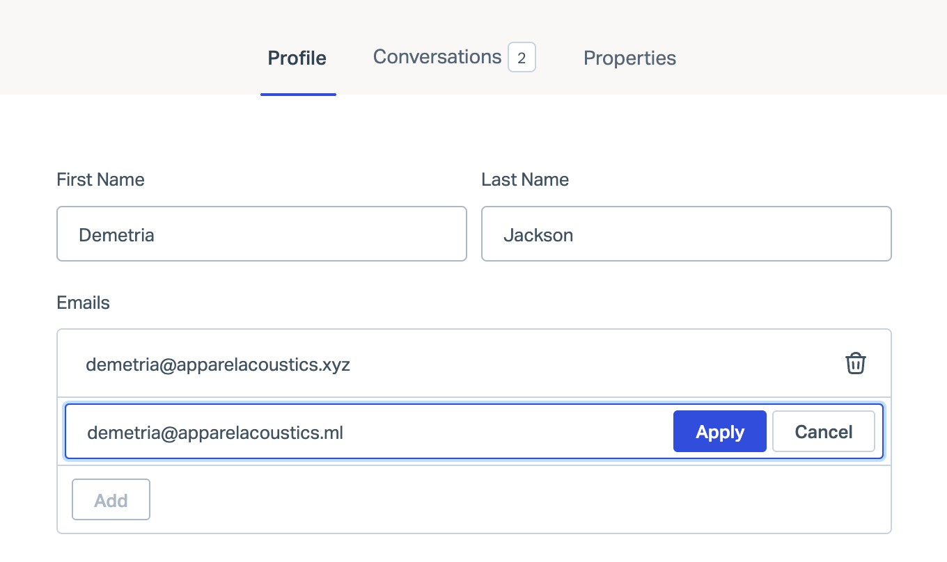 Click Add under Emails and enter the email for the profile that you're not keeping and click Apply.