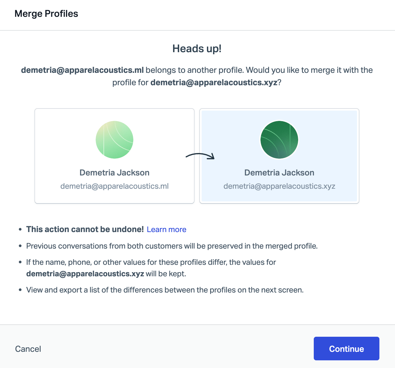 Click on the profile for the one you DO want to keep (in this example, demetria@apparelacoustics.xyz).