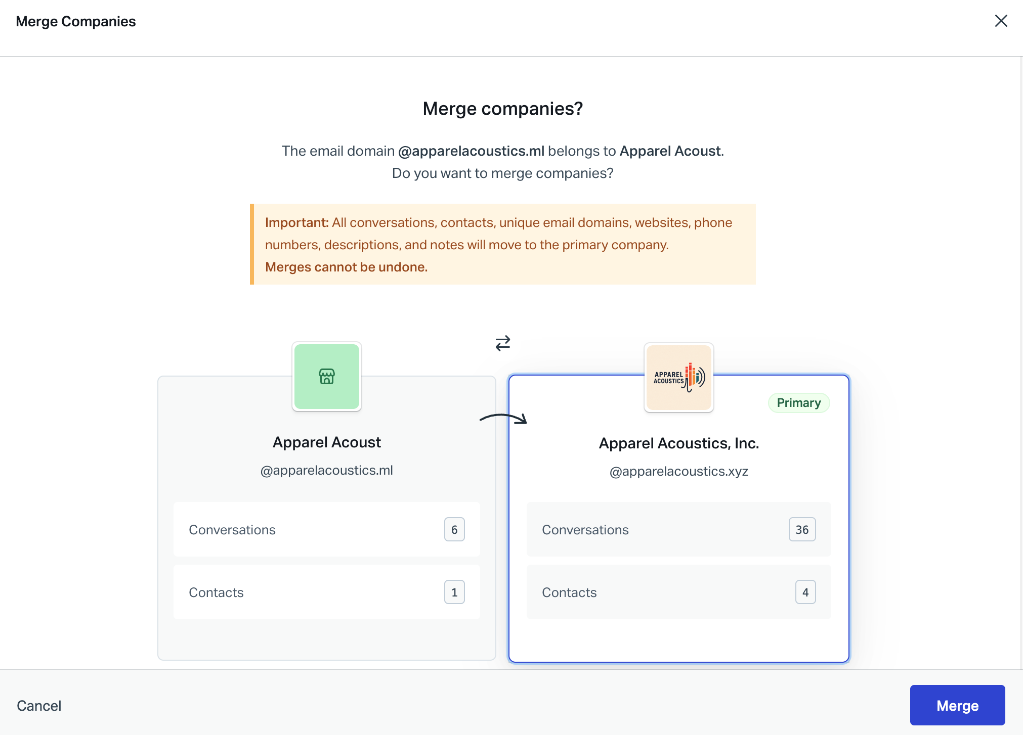 To keep everything organized and make sure your team can see the full conversation history in one place, you can merge contacts or companies into a single record.