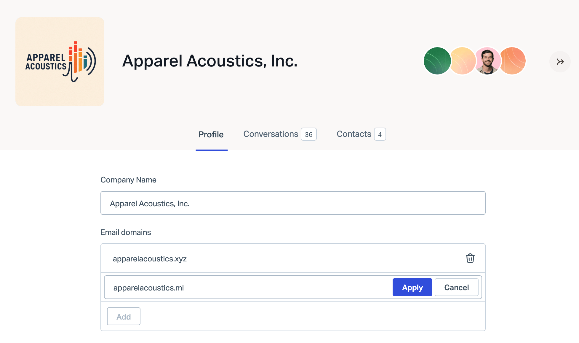 Click Add under Email domains and enter the domain for the profile that you're not keeping and click Apply.