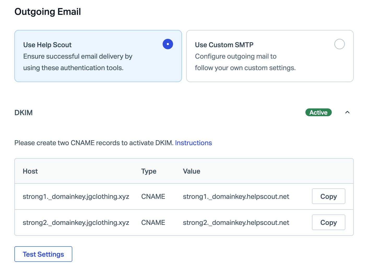 After you've updated the record with your provider, open your Help Scout Inbox and head over to Manage > Inbox(es) > [Choose your Inbox] > Outgoing Email and click the Test Settings button. If a valid CNAME record is found for your domain, you'll see the DKIM status indicator change to Active.