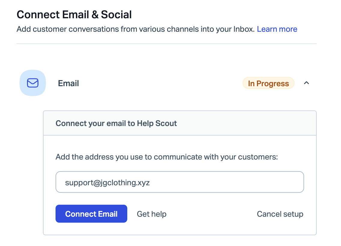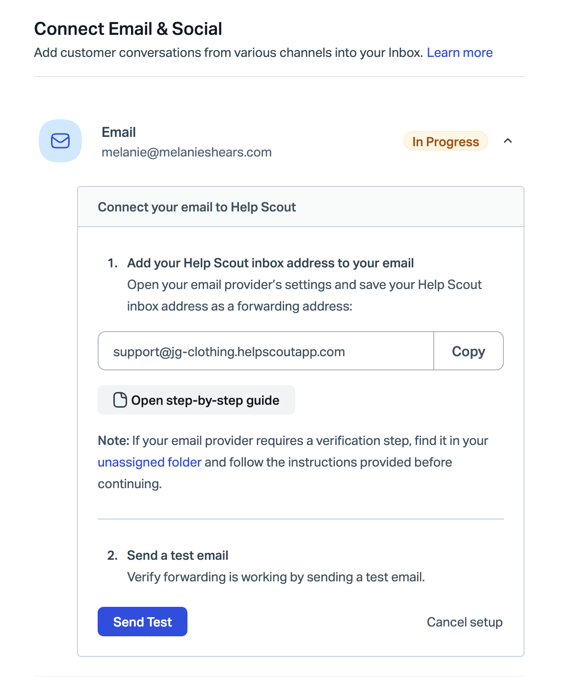 If you are using your own domain email address with Help Scout, you will need to set up forwarding or redirection from your email provider to get that email in to Help Scout. You will be forwarding or redirecting that email to the Help Scout email address you created when you created the Inbox, e.g. support@jg-clothing.helpscoutapp.com.