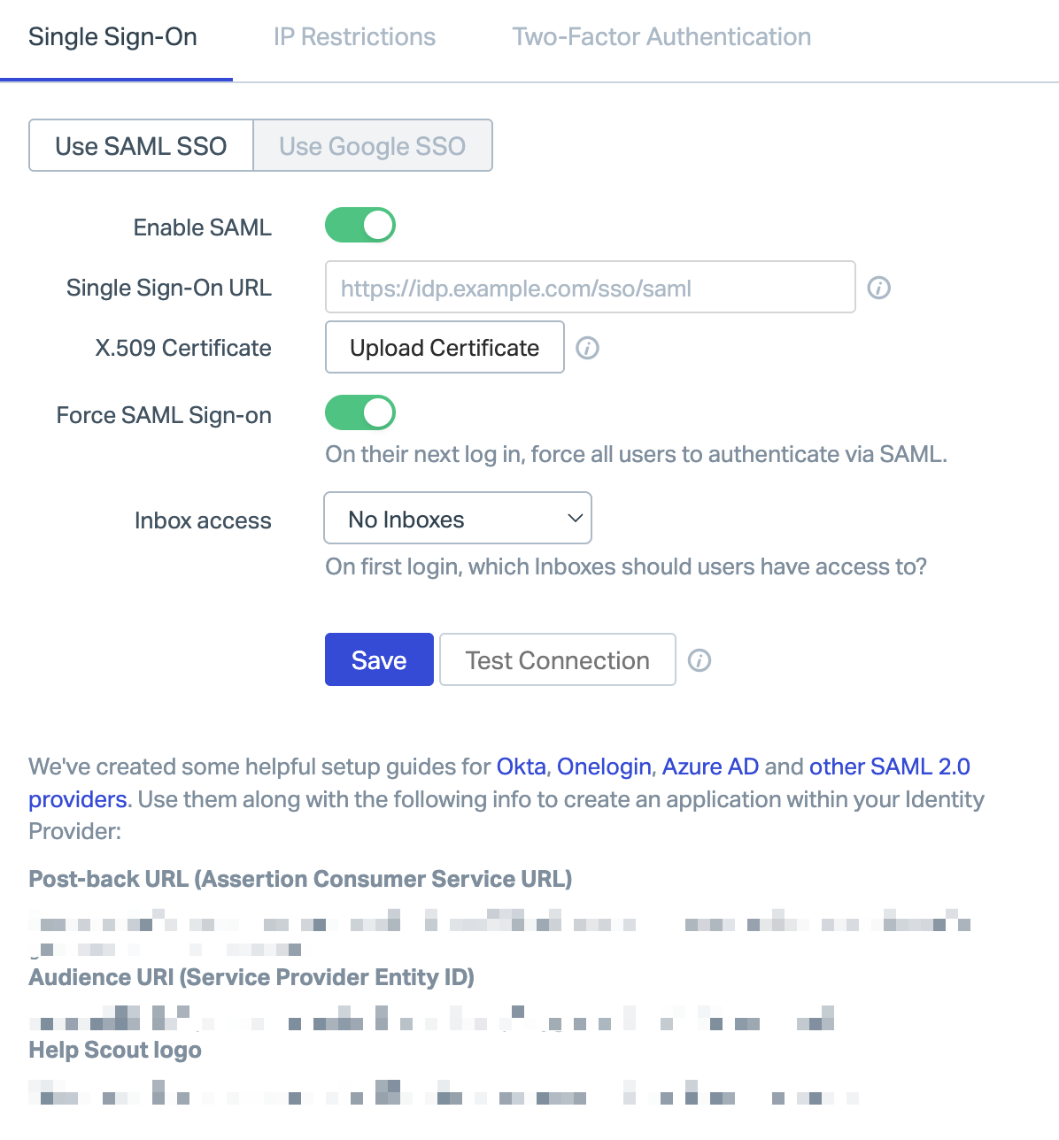 This section explains step by step how to configure SAML Single Sign-On between Help Scout and a generic Identity Provider. Please see the separate articles listed below for setup instructions if your Identity Provider is Okta, OneLogin, or Azure AD: